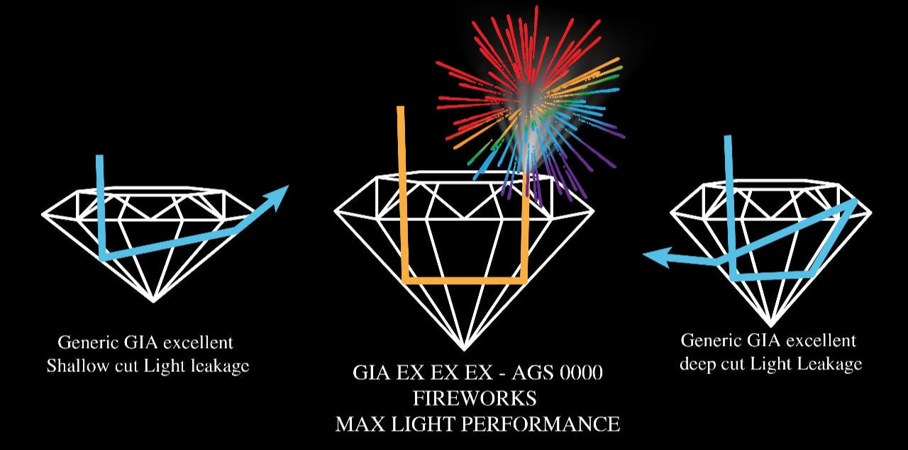 Even when a diamond is listed as excellent cut, it can still have a shallow or deep girdle. This can result in light leakage despite being labeled as excellent. Fireworks Diamonds ensures that every stone has the necessary proportions to face up larger and enhance brilliance and dispersion!
