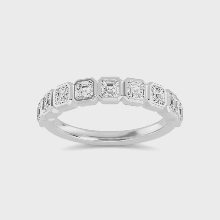 Embrace step-cut sparkle and timeless durability with this bezel set asscher cut ring. This 14K white gold wedding band features nine Asscher-cut lab-grown diamonds totaling 1.10 carats. Each lab diamond is securely bezel set for a sleek look and everyday durability; perfect for stacking or wearing alone.