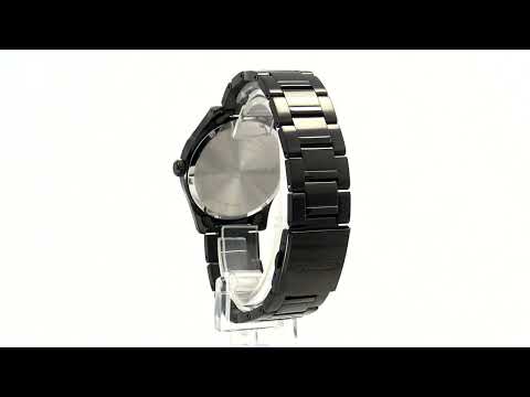 From the Essentials Collection. Designed to evoke the cool thrill of driving by night, this smooth watch offers a slim profile for sleek sport or everyday wear. The rich black dial, framed by a black metallic ring, adds a streetwear edge with its y-shaped shoe-sole pressed pattern. With big date calendar and LumiBrite hands and markers, this polished timepiece is crafted of stainless steel with black ion finish and tri-fold push button release clasp. 10 bar, 100M Water Resistant.